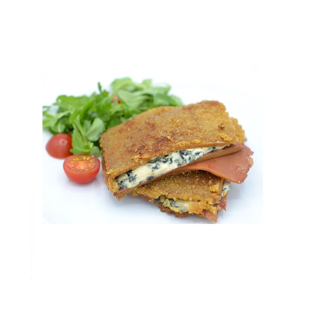 Cachopo Vegano Goumet tamaño XXL relleno de queso tipo Cabrales y lacón a la gallega. Con crujiente y delicioso empanado.