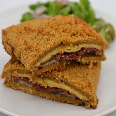 Cachopo vegano edición Goumet tamaño XXL relleno de setas (shitake, ostra y boletus) a la trufa blanca, cecina vegana y queso ahumado . Con crujiente empanado.