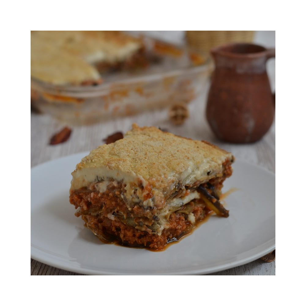 Deliciosa lasaña de berenjena y salsa boloñesa casera, elaborada a base de capas alternas de berenjena asada y jugosa salsa boloñesa de proteína de guisante, cocinada a fuego lento al estilo tradicional italiano. Gratinada con bechamel vegetal. Producto ya horneado, listo para consumo tras un breve calentamiento.
