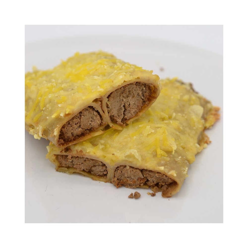 Canelones veganos rellenos de delicioso paté vegano estilo foie, y gratinados con bechamel, quesos veganos estilo gouda, parmesano y mozarella. Producto ya horneado, listo para su consumo tras un breve calentamiento.